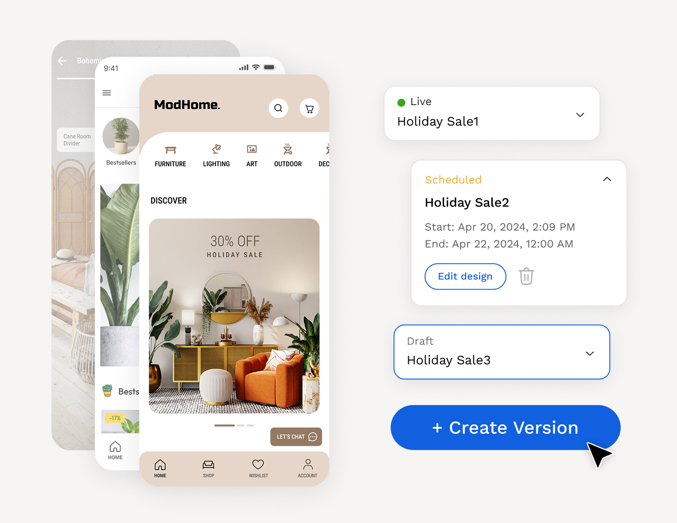 Create and manage multiple app versions for different occasions - like seasonal sales or campaigns- and take them live whenever needed.